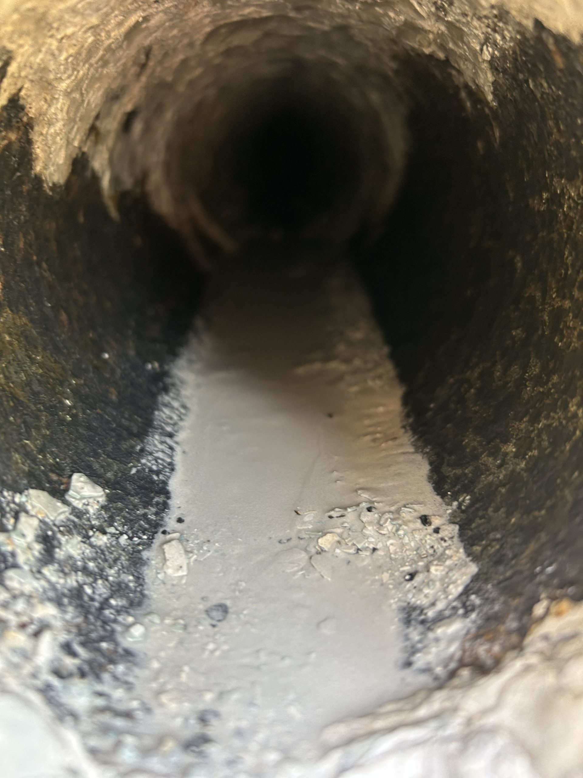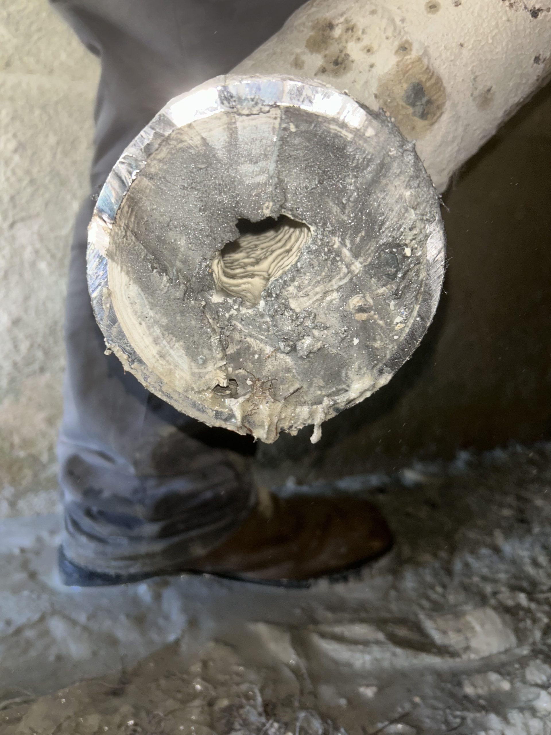 A concrete plant called us because the line to their reclaimed/recycled water was struggling to drain. The nearly 500-foot line had never been cleared in their over 40 years of operation. The line was filled with slurry, silica, and other hardened materials. We descaled portions of the pipe to open the lines sufficiently for hydro jetting and restored flow. We performed a camera inspection of the line to ensure blockages were cleared. We recommended regular preventive maintenance to avoid this in the future, which would shut down portions of their plant and halt efficient operation.